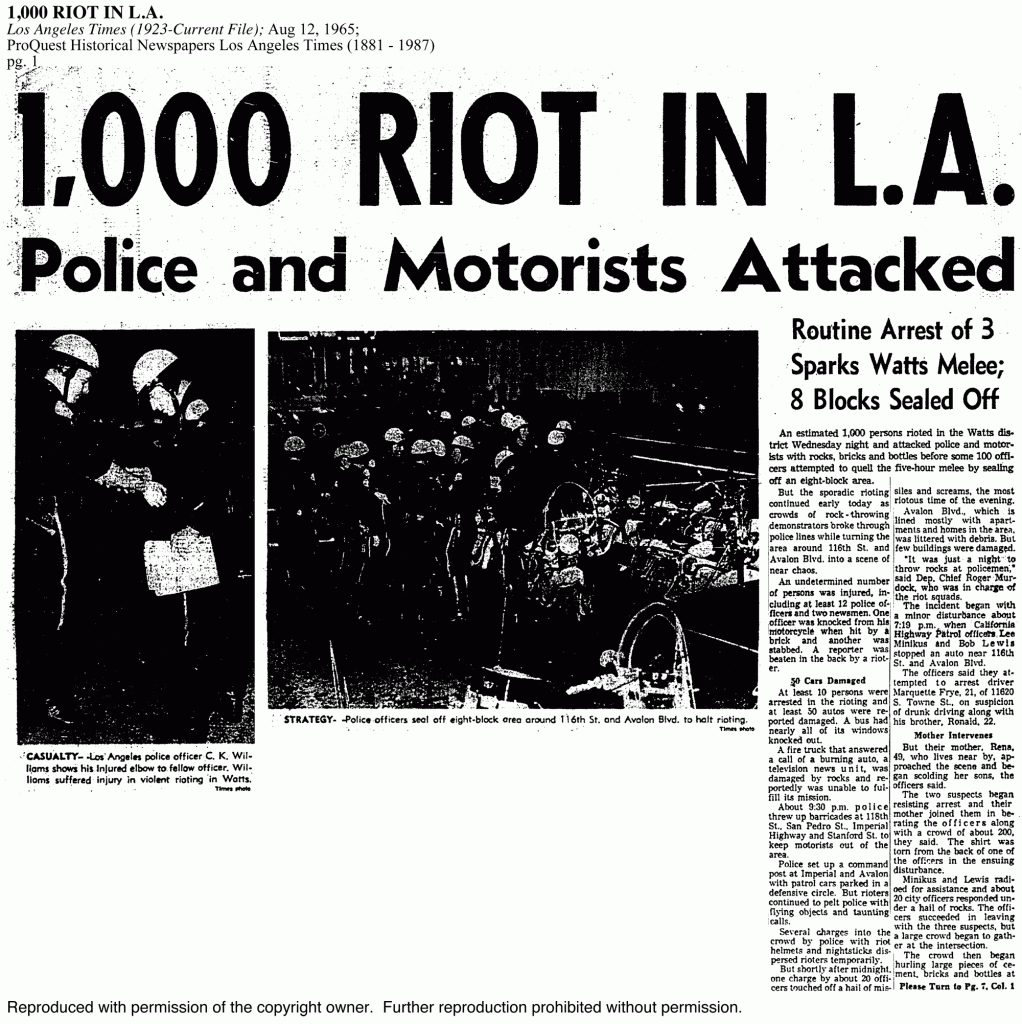 A familiar name, but not so familiar a place. There was rioting in Watts, a neighborhood out of site and out of mind. Why are they busting into stores, stealing, and setting fires? Aren’t these the problems of “Colored” folks somewhere outside of California? For us babes in the woods, Martin’s message was sinking in. We had now had evidence. We could see the smoke just 10 miles away. For the most part, neither our parents or teachers talked about causation. It was just senseless violence perpetrated by thugs living south of Central. End of story!
